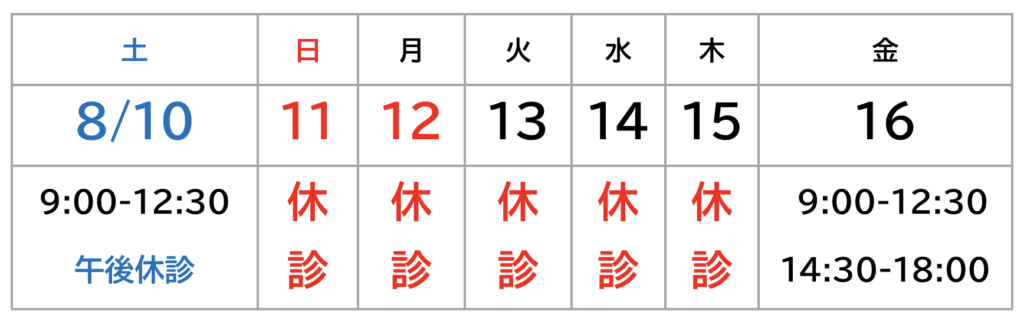 2024/07/29 夏季休診のお知らせ 当院は、8/10(土)午後から8/15(木)まで 休診とさせていただきます。 8/16(金)からは通常通り診療いたします。 ご不便をおかけいたしますが、ご理解のほどお願い申し上げます。 一覧へ戻る